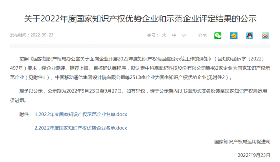 9月23日,國家知識產權局公布了“2022年度國家知識產權優勢企業和示范企業評定結果公示”,中材科技榮獲2022年度國家知識產權示范企業。 中材科技自成立以來,始終堅持“科技創新”與“知識產權保護”相結合的原則,規范知識產權管理,促進科技成果轉化。2017年,中材科技成功入選國家知識產權優勢企業名......